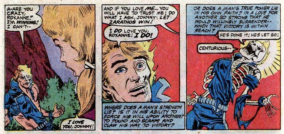 Zarathos finds Centurious and attacks, quickly overpowering his foe. Just as quickly, however, the Ghost Rider finds his power fading away and Centurious (who was feigning defeat) easily beats down on the demon. Centurious explains that without Blaze's soul, Zarathos will grow weaker and weaker until he finally dies - that is the revenge that Centurious has planned for his greatest enemy. Centurious buries Zarathos under the collapsed church, then explains to Roxanne that he will let her live out of remorse for her lost love. After the villain departs, Roxanne sees Zarathos painfully dig himself free from the wreckage. She tells him that they need to reunite him with Johnny, which Zarathos hates but ultimately accepts.